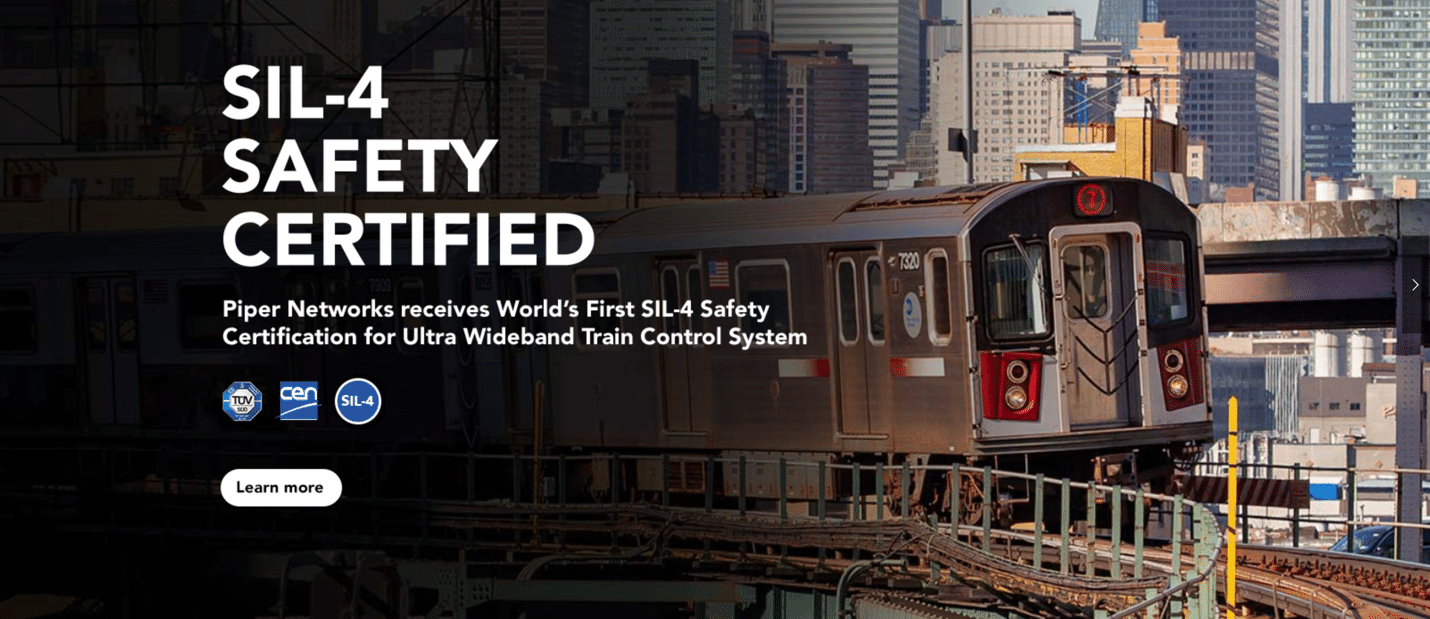 Piper Networks has received a CENELEC Safety Integrity Level 4 (SIL-4) Certification for its Ultra Wideband (UWB) train control system from independent safety assessor, TÜV SÜD. The certification is a milestone achievement for Piper and the transportation industry as it becomes the first ever UWB-based position and speed technology to achieve vitality. The system is now ready for integration with signaling and train control programs being implemented by transportation agencies and their engineering contractors in the US and worldwide.